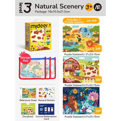 Discover a new level of puzzle fun with the Level Up! Puzzles - Level 3: Natural Scenery. Designed to support growing minds, this set offers three progressively challenging puzzles that promote logical thinking, hand-eye coordination, and storytelling skills.