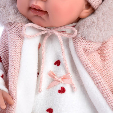 Tina is cuddly and cute! She's wearing the softest, cutest PJ's with hearts along with a hoodie vest as she plays and coos happily!