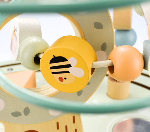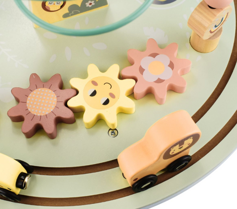 This multi-functional wooden activity table invites little explorers to travel winding bead trails, sort colourful shapes, and meet cheerful wooden friends. Every twist, push, and slide sparks curiosity and builds important developmental skills through engaging play.