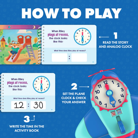 The interactive plane clock encourages children to set the time on the analog face, then verify their answer by revealing the digital time display. This self-checking feature promotes independent learning and builds confidence as kids master time-telling skills at their own pace.