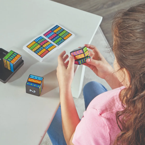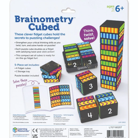 Put critical thinking skills to the test with over 40 brain-bending logic puzzles! Young minds tackle increasingly challenging Brainometry Cubed puzzles by spinning and twisting the colorful cubes to match each challenge card configuration.