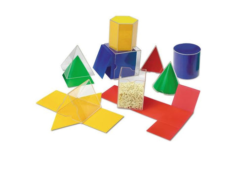 This innovative folding geometric shape set is perfect for hands-on lessons in symmetry, perimeter, area, surface area and volume. Each three-inch shape folds flat, allowing for illustration of a three-dimensional shape's two-dimensional properties. Edges are all rounded for safety.