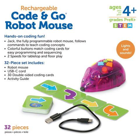 - Rechargeable Robot Mouse!: Jack lights-up, makes sounds, and features 2 speeds along with colourful buttons to match coding cards for easy programming and sequencing. Includes USB charging cord.