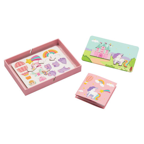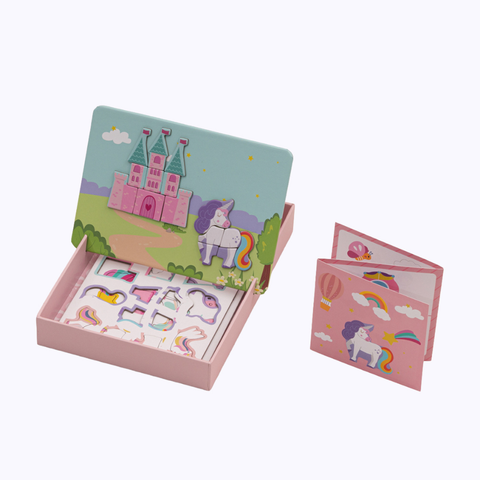 Open the box and step into a magical unicorn kingdom! This enchanting magnetic play set features a fold-out scene and a collection of colourful magnetic pieces for creating endless fairy-tale adventures. Children can arrange and rearrange unicorns, castles, rainbows, and more, making a new story every time they play.