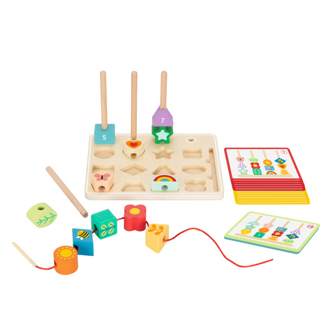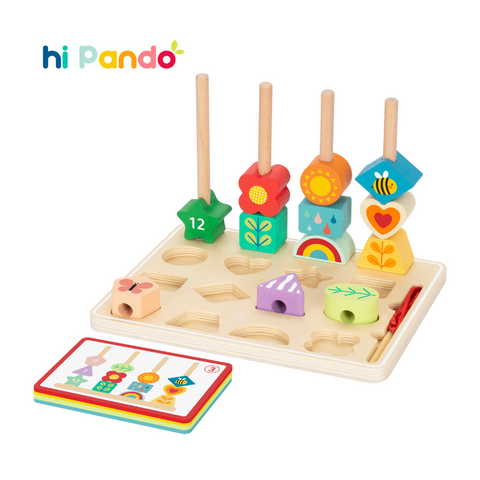 This versatile set is a fun and educational activity designed to engage young learners. It features a wooden board with three vertical rods, each marked with numbers and shapes at the base, allowing children to slide and stack colourful, uniquely shaped blocks onto the rods. The set also includes pattern cards to encourage the creation of sequences and patterns, fostering cognitive development and fine motor skills.