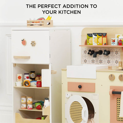 This soft pastel-coloured set includes four deliciously designed flavour pots, featuring a tempting assortment of apricot, vanilla, raspberry, and strawberry. Each pot's natural wood lid is exquisitely engraved with intricate details, adding a touch of realism to their  imaginative play.