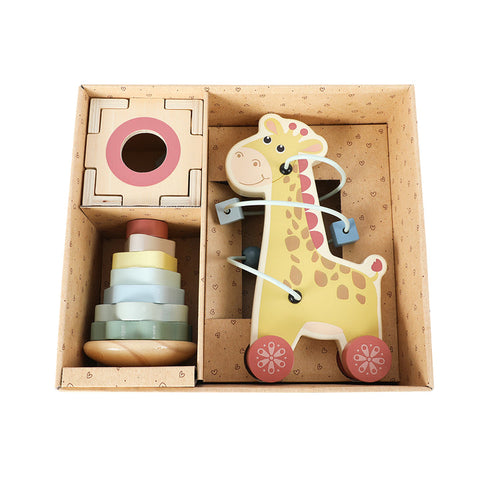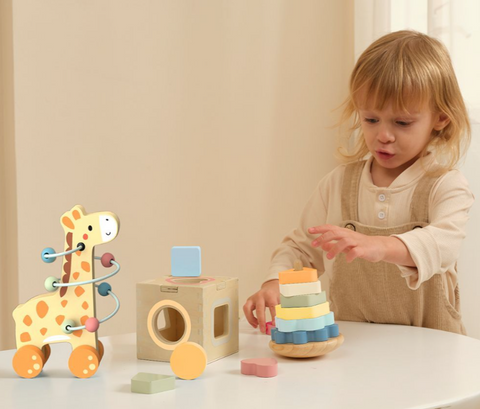 This engaging 3-in-1 wooden toy set features a pull-along giraffe with sliding beads, a stacking tower and a shape sorter, all designed to support early learning through play. The bead maze around the giraffe’s neck helps develop fine motor skills, while the stacking tower promotes colour recognition and coordination.