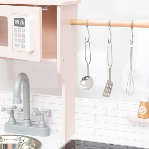 This stylish, modern play kitchen empowers children to tap into their creativity and independence in the kitchen. With its interactive features and authentic design, the Little Chef’s Kitchen brings the joy of cooking to life, teaching valuable skills like organization, responsibility, and self-expression.