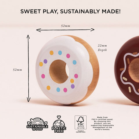 Each doughnut is crafted from solid wood with smooth kid safe edges. Decorated in pretty pastel colourways using non toxic water based paints and adorned with sprinkles and swirls. All presented in sweet retro gift box style packaging.