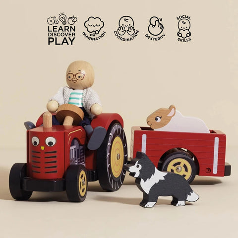 This striking red wooden tractor and trailer set is just the ticket for budding young farmers.