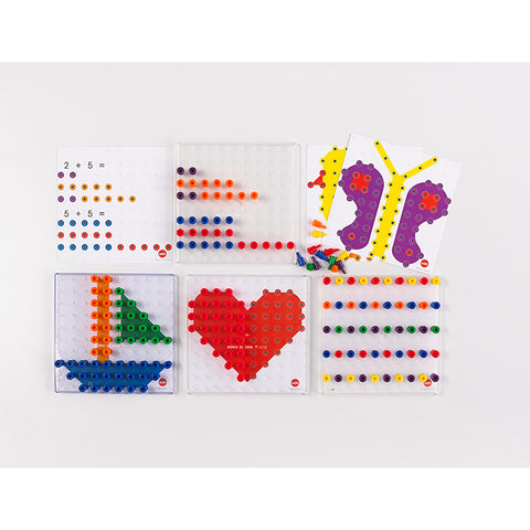This Peg Activity Set includes 600 pegs in 6 bright colours, 4 clear pegboards, and 15 x 2-sided activity cards.