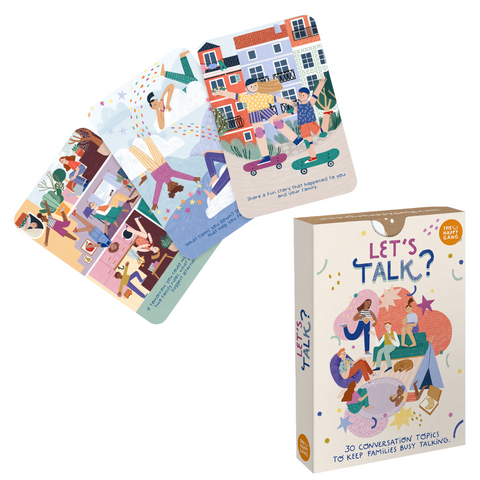 Family conversations and conversations about family (and beyond) can be challenging, but they are very important for everyone. The "Let's Talk" flashcards from The Happy Gang feature a set of 30 cards with different questions and themes, accompanied by a comprehensive guidebook with practical suggestions for use.