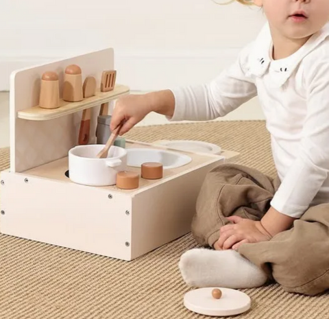 This compact mini tabletop kitchen is perfect for smaller spaces or to take along on trips. Complete with realistic cooking accessories and play food, it provides endless imaginative play opportunities for budding young chefs.